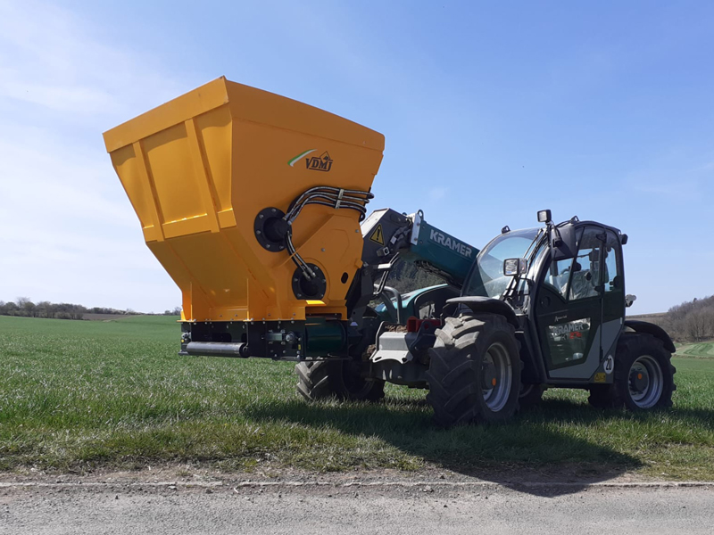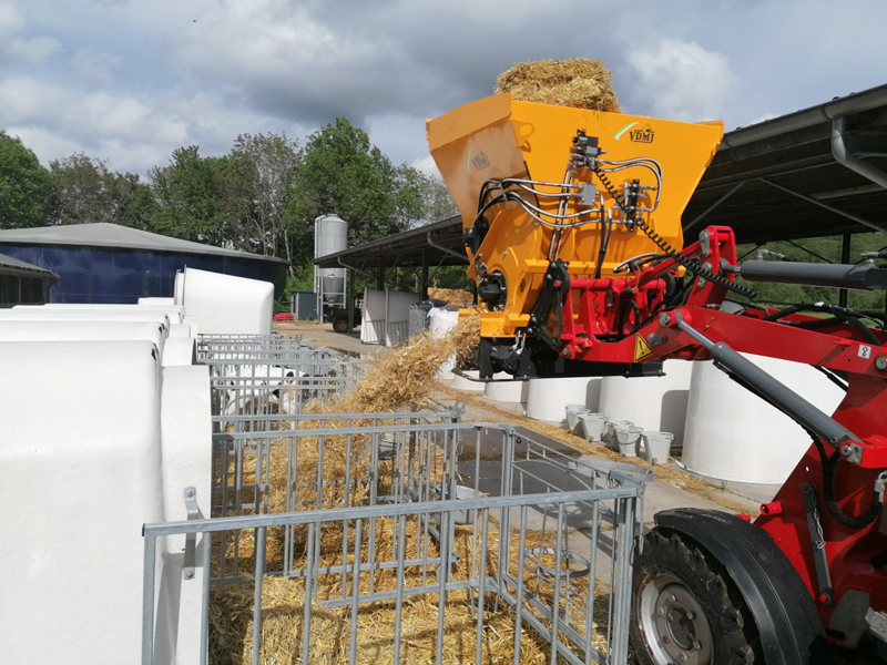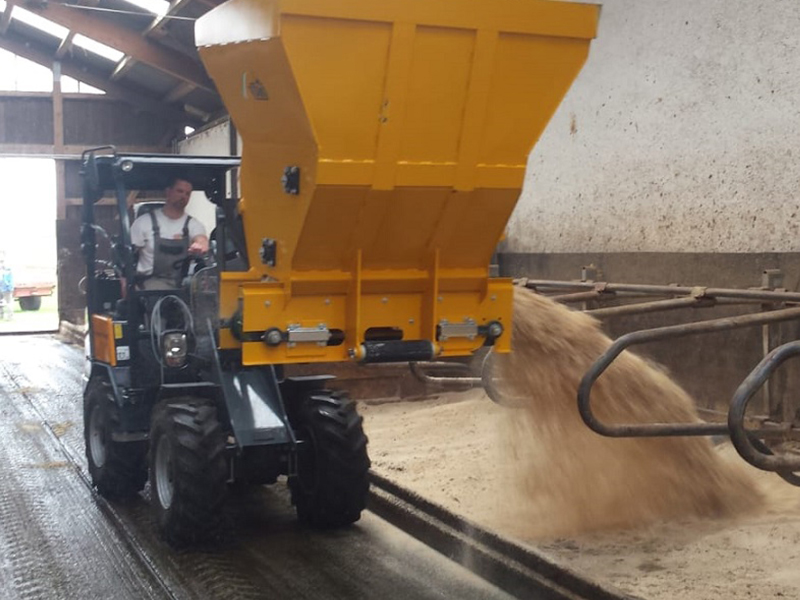 Dieser Einstreugerät kann auch zum Füttern verwendet werden. Mais, kurzes Gras, Brocken, Mischfutter… sind für diese Maschine kein Problem.