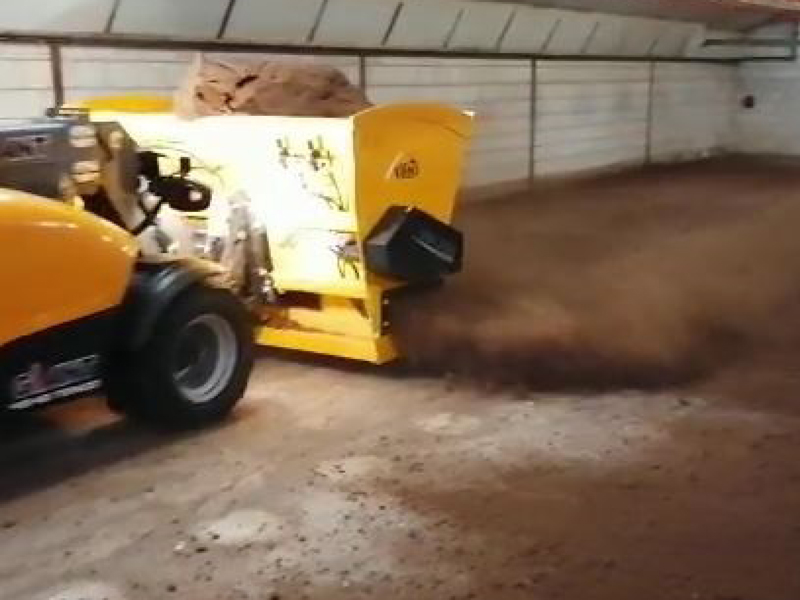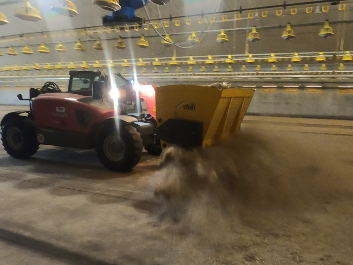 Mit der SSB ist es möglich, Geflügelställe schnell und effizient einzustreuen. Verschiedene Materialien wie Holzspäne, Sägemehl, Torf/Kompost, gehäckseltes Stroh, Strohpellets… können verarbeitet und auf einer Breite von bis zu 6 Metern ausgebracht werden (je nach Ölfluss). Sowohl die Menge als auch die Streubreite sind einstellbar.