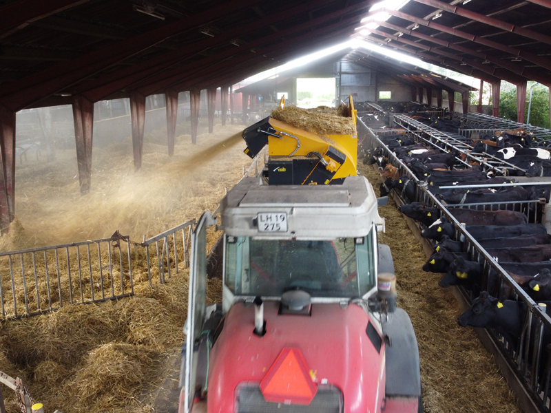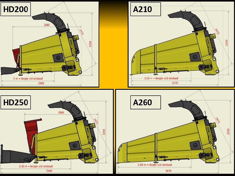 Diese Reihe von Strohgebläsen ist speziell für schwere Radlader und Teleskoplader konzipiert. Die Maschinen können je nach Kundenwunsch komplett montiert werden. Es können feste Verlängerungen mit Ladelängen von 2,10 m (A210) oder 2,60 m (A260) gewählt werden. Wenn die Maschine kompakt bleiben soll, kann eine hydraulische Verlängerung an der Vorderseite der Maschine gewählt werden. Diese haben eine Ladelänge von 2,00m (HD200) oder 2,50m (HD250). Auch der Strohauswurf kann je nach Bedarf gewählt werden. Bei einem festen Strohauswurf (V) kann das Stroh nur in der Nähe oder in der Ferne verteilt werden (12-18 m je nach Ölfluss). Mit einem um 300° drehbaren Strohauswurf kann ebenfalls nah oder weit gestreut werden, allerdings über einen Bereich von 300°. Mit diesen Strohbläsern können sowohl Quader- als auch Rundballen verarbeitet werden. Die komplette Steuerung der Maschine erfolgt über eine elektrische Joystick-Box in der Kabine.